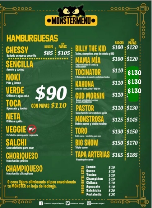 Monster Burgers Menu